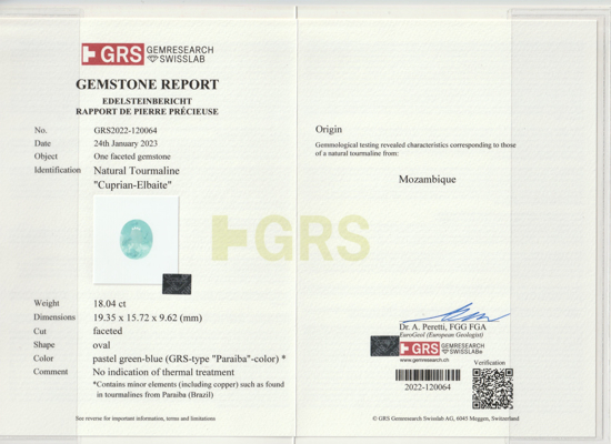 Natural Loose Blue Paraiba Tourmaline weighing 18.04ct & measuring 19.35 x 15.72 x 9.62 mm from Mozambique. The Paraiba Tourmaline is cut in an ideal Oval shape which compliments the gemstone very well. GRS Certificate also available. Paraiba Tourmaline gemstones are beautiful for all occasions and can be worn for many benefits as well. Please dont forget to check our Gem Journal for more updates on latest trends from the Gemstone and Jewelry Industry