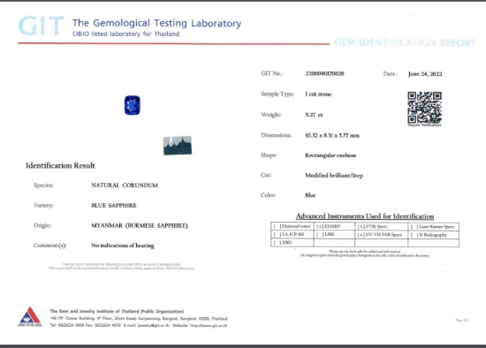 Natural Loose Blue Sapphire Unheated Burma weighing 5.27ct & measuring 10.32 x 8.31 x 5.77 mm from Burma. The Blue Sapphire is cut in an ideal Cushion shape which compliments the gemstone very well. GIT Certificate also available. Blue Sapphire gemstones are beautiful for all occasions and can be worn for many benefits as well. Please dont forget to check our Gem Journal for more updates on latest trends from the Gemstone and Jewelry Industry