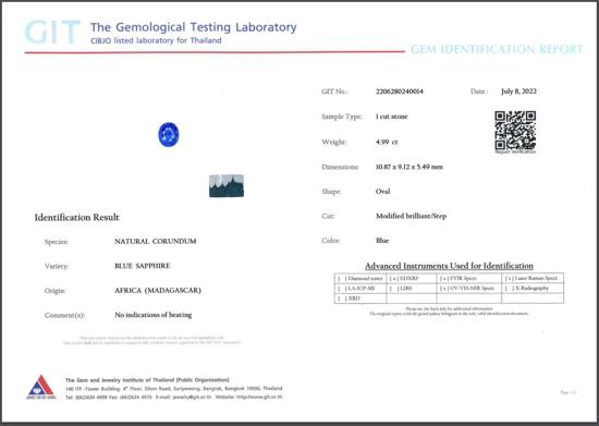 Natural Loose Blue Sapphire Unheated Madagascar weighing 4.99ct & measuring 10.87 x 9.12 x 5.49 mm from Madagascar. The Blue Sapphire is cut in an ideal Oval shape which compliments the gemstone very well. GIT Certificate also available. Blue Sapphire gemstones are beautiful for all occasions and can be worn for many benefits as well. Please dont forget to check our Gem Journal for more updates on latest trends from the Gemstone and Jewelry Industry