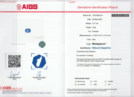 Natural Loose Sapphire Unheated Madagascar weighing 2.30ct & measuring 8.53 x 6.31 x 4.72 mm from Madagascar. The Blue Sapphire is cut in an ideal Oval shape which compliments the gemstone very well. AIGS Certificate also available. Blue Sapphire gemstones are beautiful for all occasions and can be worn for many benefits as well. Please dont forget to check our Gem Journal for more updates on latest trends from the Gemstone and Jewelry Industry