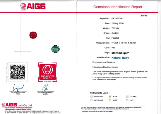 Natural Loose Heated Mozambique Ruby weighing 7.20ct & measuring 12.35 x 11.76 x 4.46 mm from Mozambique. The Mozambique Ruby is cut in an ideal Cushion shape which compliments the gemstone very well. AIGS Certificate also available. Mozambique Ruby gemstones are beautiful for all occasions and can be worn for many benefits as well. Please dont forget to check our Gem Journal for more updates on latest trends from the Gemstone and Jewelry Industry