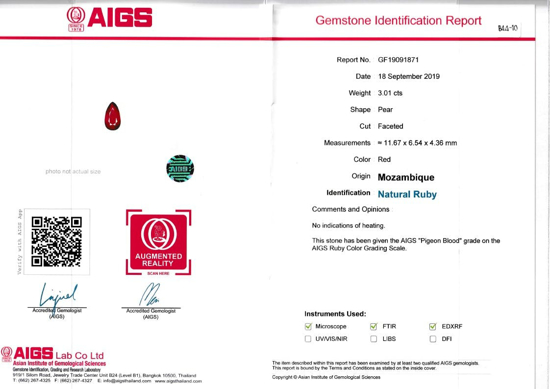 Natural Loose Unheated Mozambique Ruby weighing 3.01ct & measuring 11.67 x 6.54 x 4.36 mm from Mozambique. The Mozambique Ruby is cut in an ideal Pear shape which compliments the gemstone very well. AIGS Certificate also available. Mozambique Ruby gemstones are beautiful for all occasions and can be worn for many benefits as well. Please dont forget to check our Gem Journal for more updates on latest trends from the Gemstone and Jewelry Industry