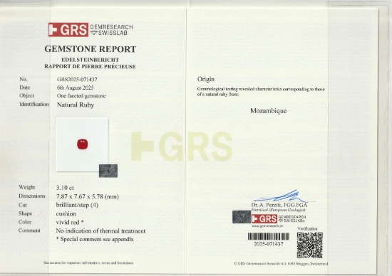 Natural Loose Unheated Mozambique Ruby weighing 3.10ct & measuring 7.87 x 7.67 x 5.78 mm from Mozambique. The Mozambique Ruby is cut in an ideal Cushion shape which compliments the gemstone very well. GRS Certificate also available. Mozambique Ruby gemstones are beautiful for all occasions and can be worn for many benefits as well. Please dont forget to check our Gem Journal for more updates on latest trends from the Gemstone and Jewelry Industry
