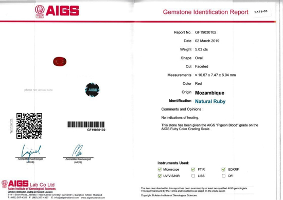 Natural Loose Unheated Mozambique Ruby weighing 5.03ct & measuring 10.67 x 7.47 x 6.04 mm from Mozambique. The Mozambique Ruby is cut in an ideal Oval shape which compliments the gemstone very well. AIGS Certificate also available. Mozambique Ruby gemstones are beautiful for all occasions and can be worn for many benefits as well. Please dont forget to check our Gem Journal for more updates on latest trends from the Gemstone and Jewelry Industry