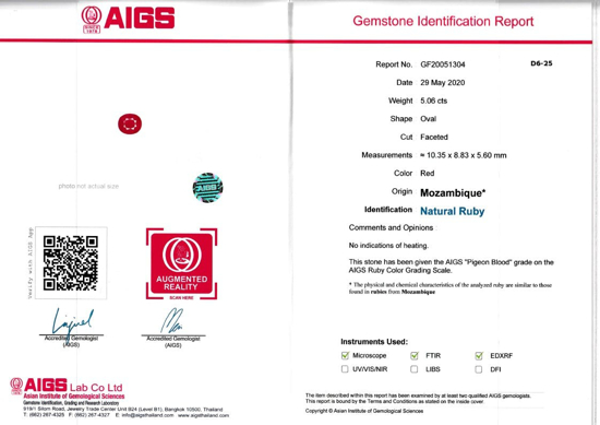 Natural Loose Unheated Mozambique Ruby weighing 5.06ct & measuring 10.35 x 8.83 x 5.60 mm from Mozambique. The Mozambique Ruby is cut in an ideal Oval shape which compliments the gemstone very well. AIGS Certificate also available. Mozambique Ruby gemstones are beautiful for all occasions and can be worn for many benefits as well. Please dont forget to check our Gem Journal for more updates on latest trends from the Gemstone and Jewelry Industry