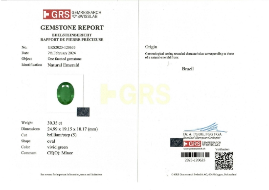 Natural Loose Green Colombian Emerald weighing 30.35ct & measuring 25.03 x 19.15 x 10.18 mm from Brazil. The Colombian Emerald is cut in an ideal Oval shape which compliments the gemstone very well. GRS Certificate also available. Colombian Emerald gemstones are beautiful for all occasions and can be worn for many benefits as well. Please dont forget to check our Gem Journal for more updates on latest trends from the Gemstone and Jewelry Industry